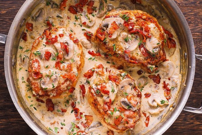 Chuletas de Cerdo Asadas con Tocino y Champiñones