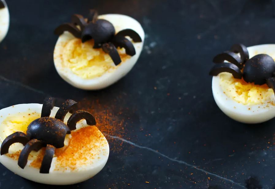 - Cortar la aceituna por la mitad. Agregue la mitad al centro de cada huevo que será el cuerpo de la araña. Corta la mitad restante de la aceituna en juliana para las patas de araña. Coloque con cuidado las rodajas de aceituna a lo largo de los lados del cuerpo.