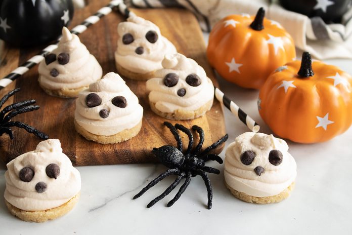 - Retire las masas del refrigerador y, con una bolsa decorativa, coloque la mezcla de queso crema para formar fantasmas. Agregue chispas de chocolate negro para los ojos.
