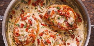 Chuletas de Cerdo Asadas con Tocino y Champiñones
